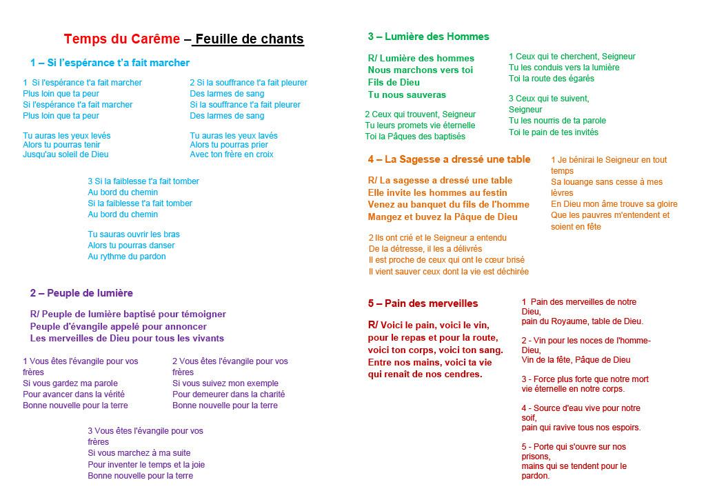 Feuille de chants - Temps du Carême 2022